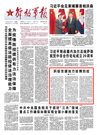 在2月3日召开的中共中央政治局常务委员会会议上,习主席对人民军队积极支援地方疫情防控工作给予充分肯定。这既是对全军官兵的巨大鼓舞,也是对军队继续打好疫情防控阻击战的有力鞭策。广大官兵和医护人员要牢记宗旨、紧急行动,无私奉献、英勇奋战,始终保持战斗状态,坚决当好疫情防控的先锋队突击队,为打赢疫情防控的人民战争义无反顾、冲锋在前,积极贡献自己的力量。